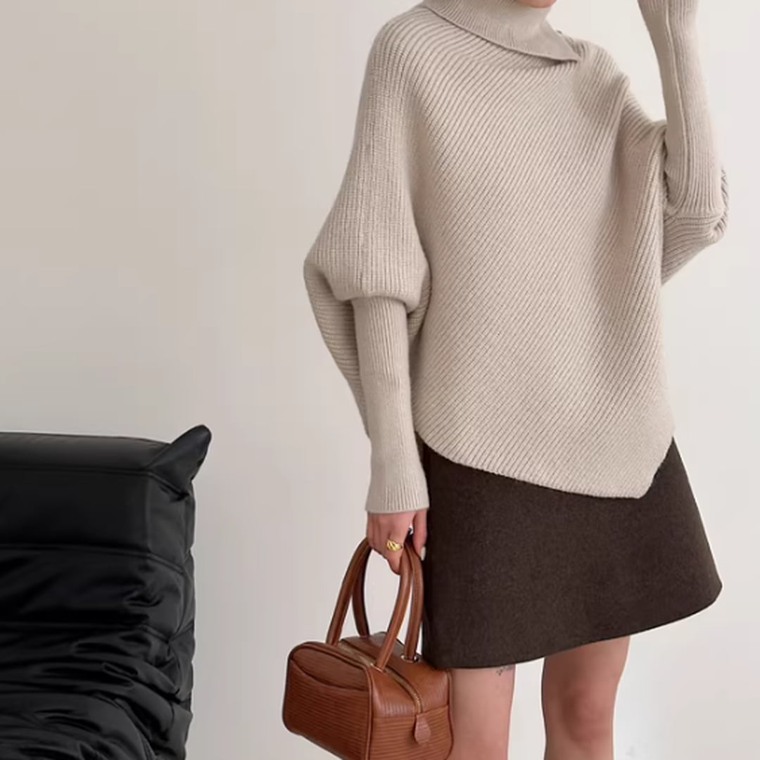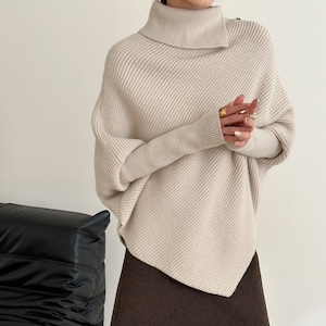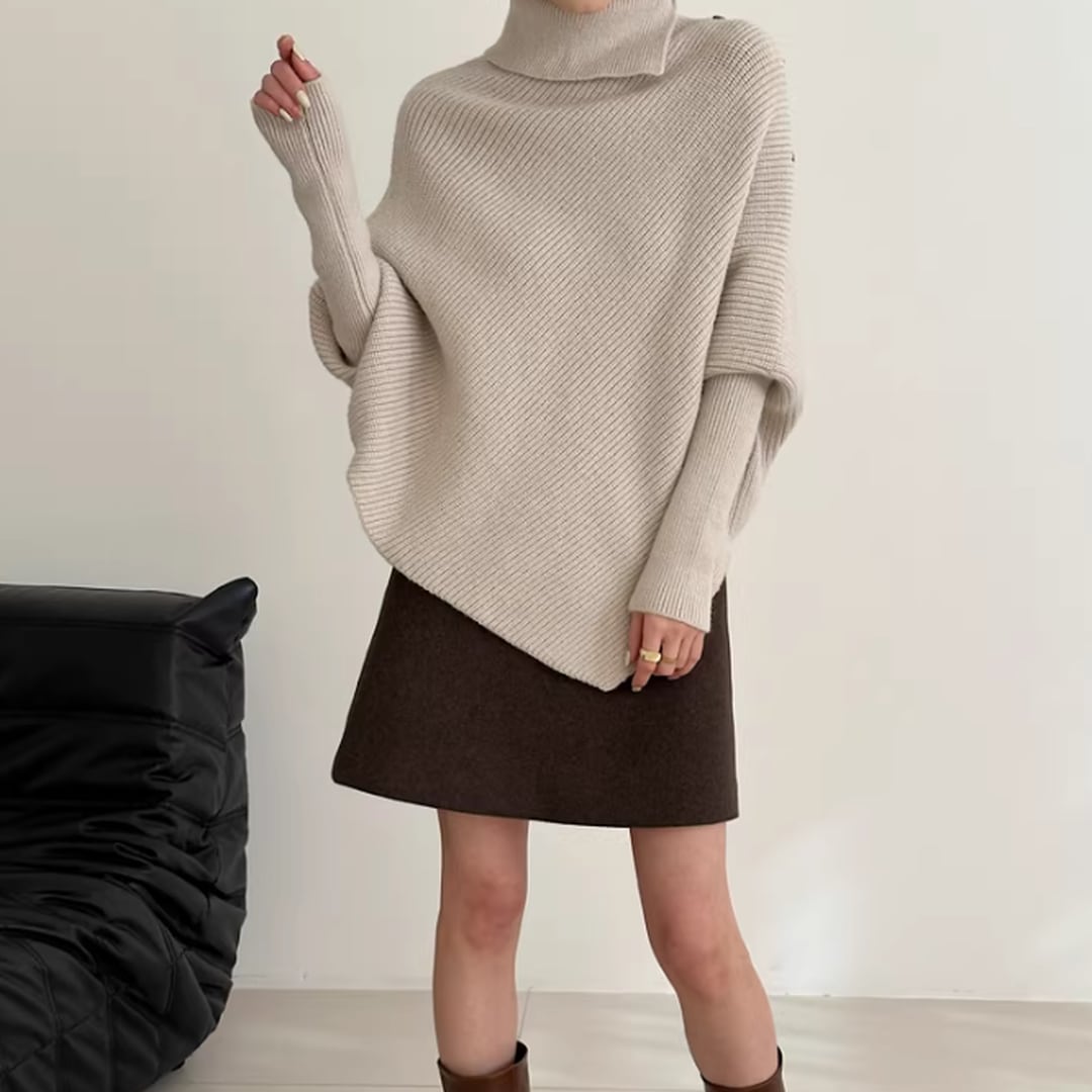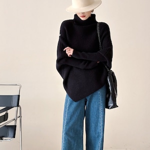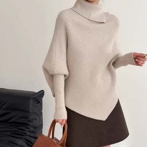 アシンメトリーなデザインが目を惹く、こなれ感たっぷりのニット。