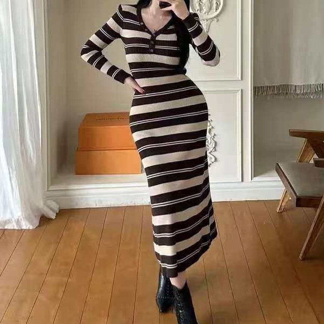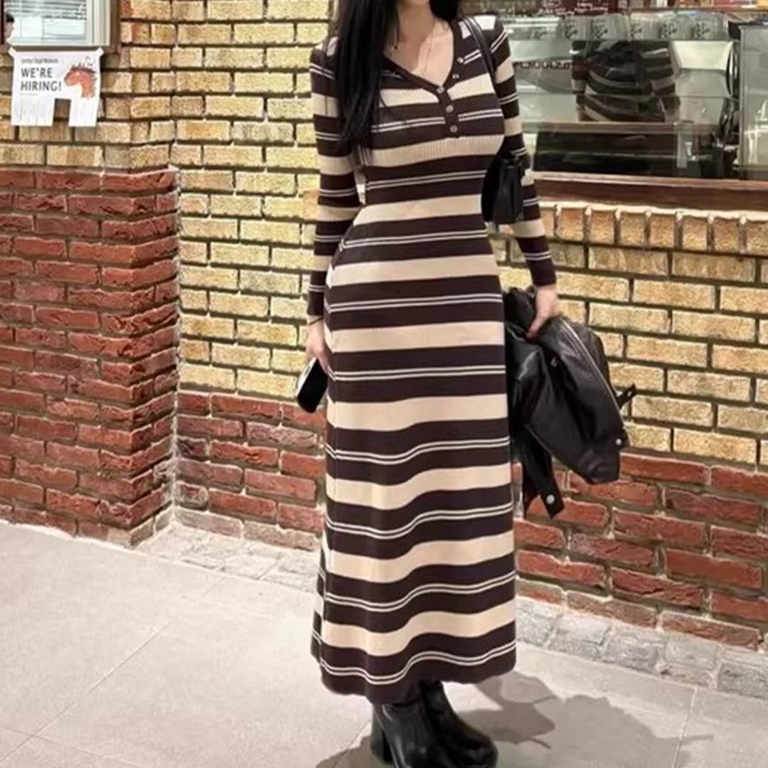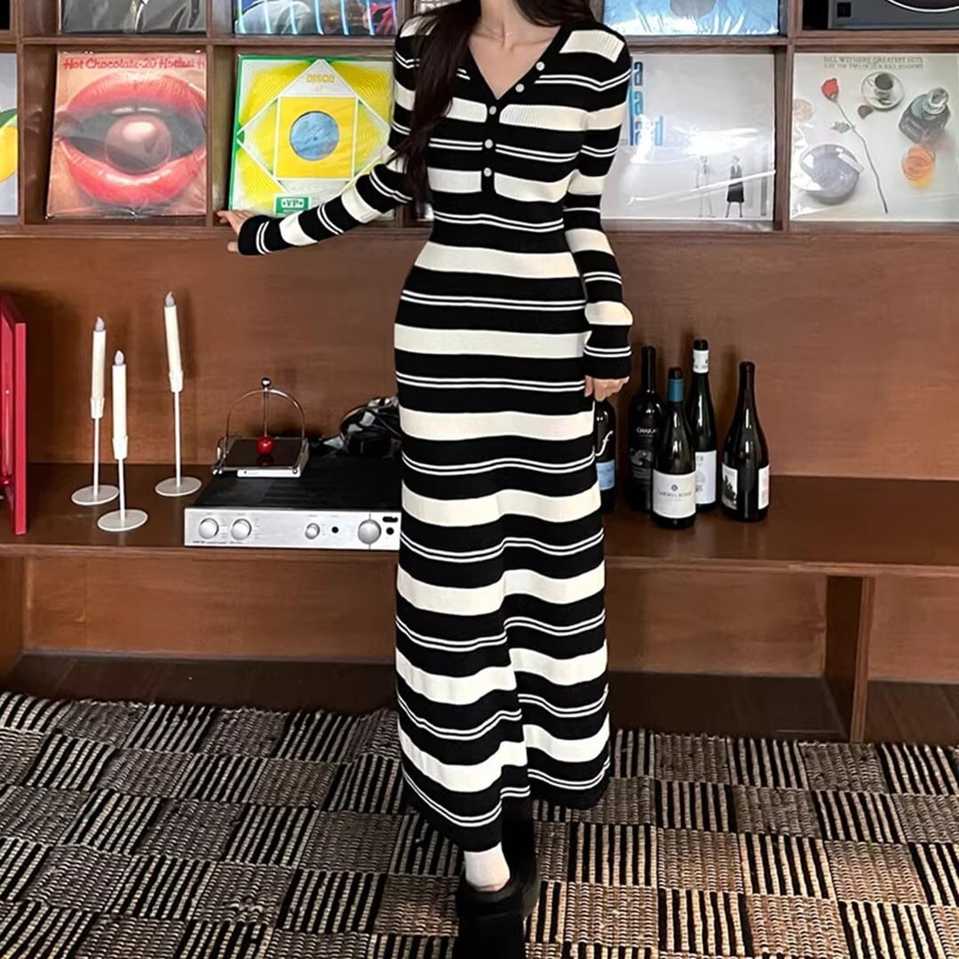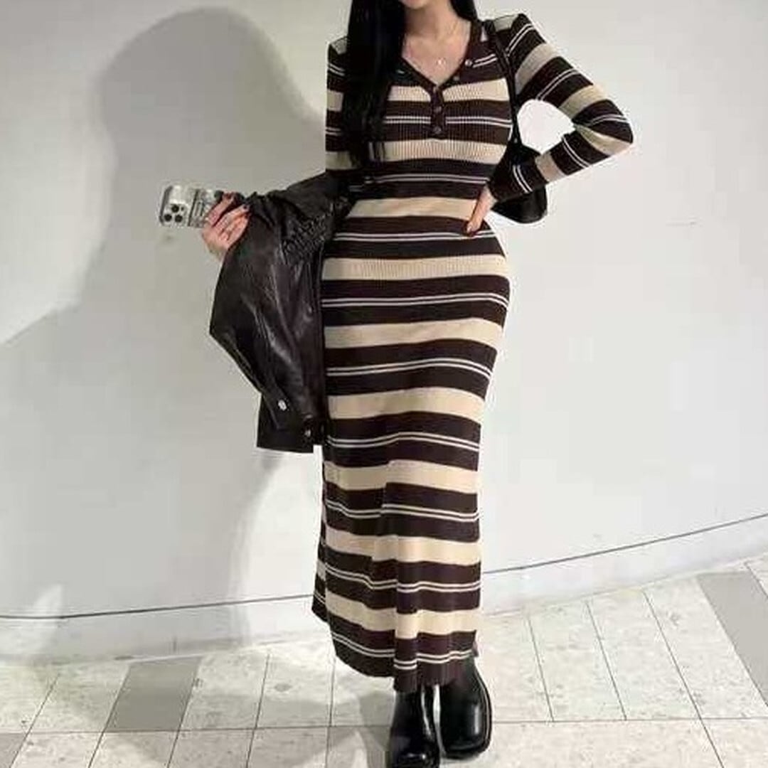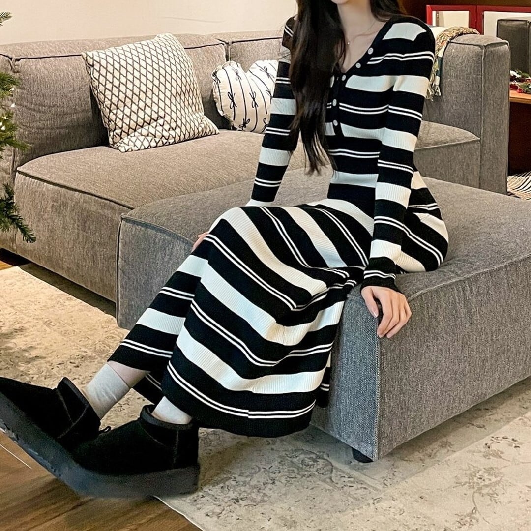 ボタンフロント マキシ丈 ボーダー ワンピース/2col M02947