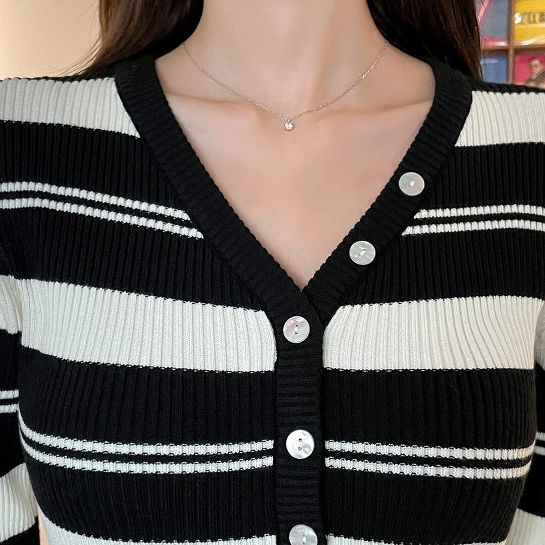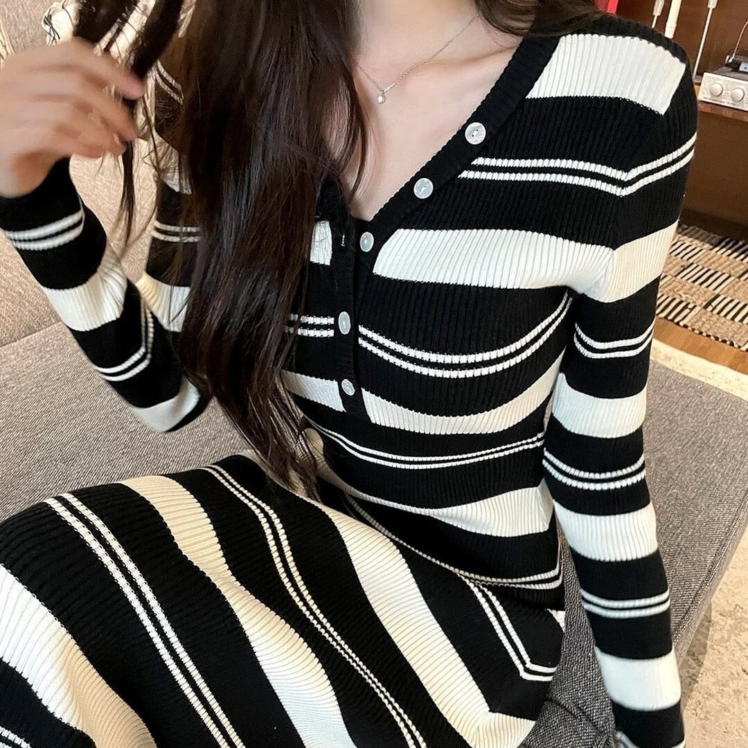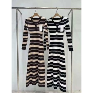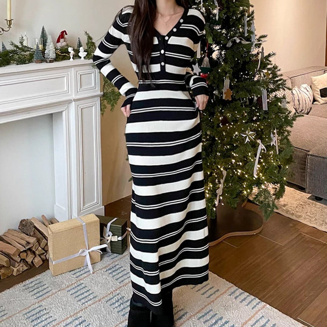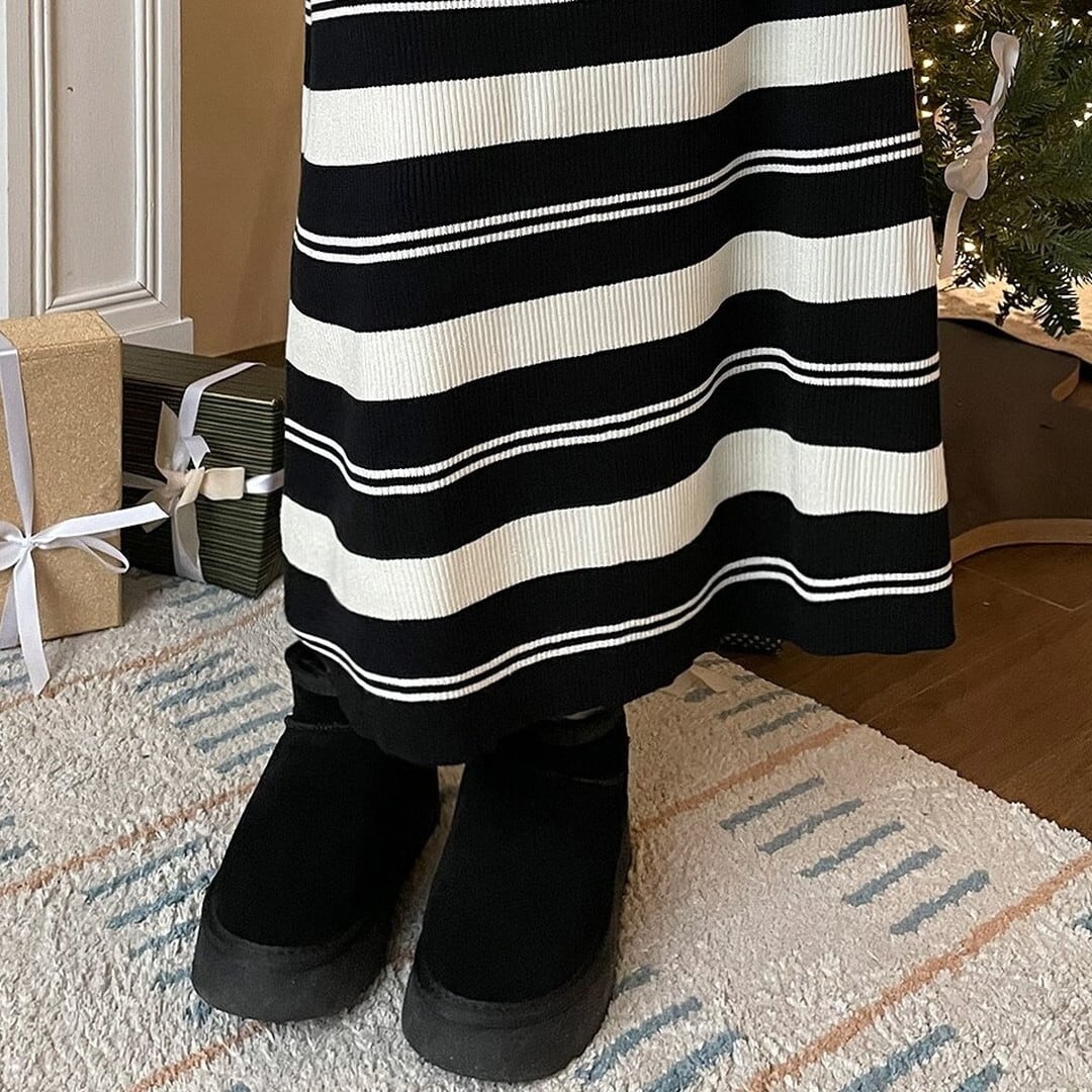 ボタンフロント マキシ丈 ボーダー ワンピース/2col M02947