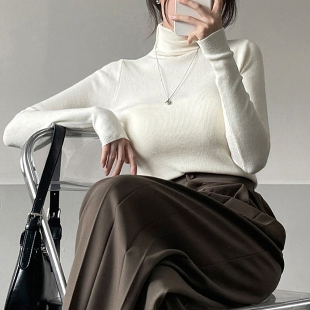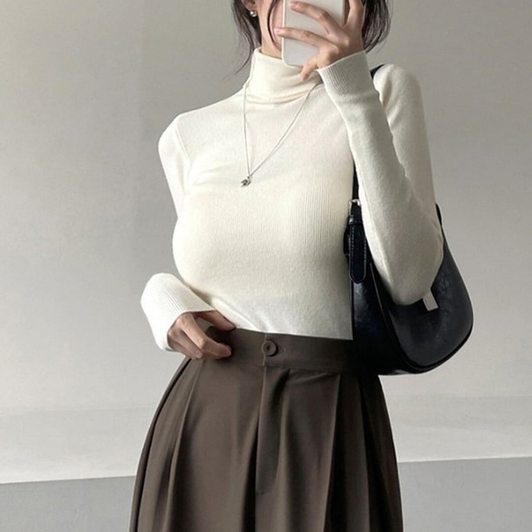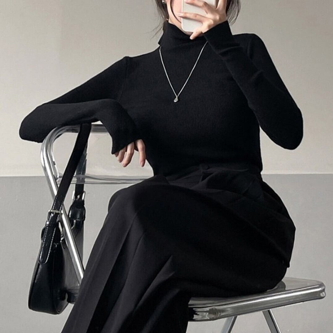 シンプルで着回し力抜群の、長袖タートルネックトップス。