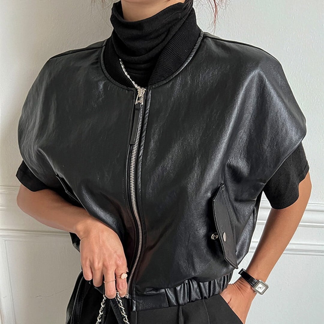 クールな印象をプラスする、フェイクレザージップアップノースリーブジャケット。