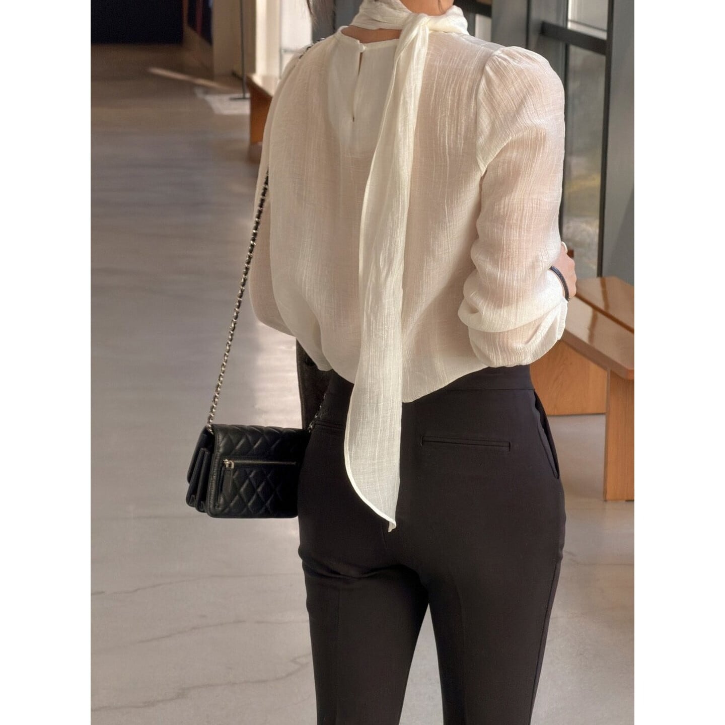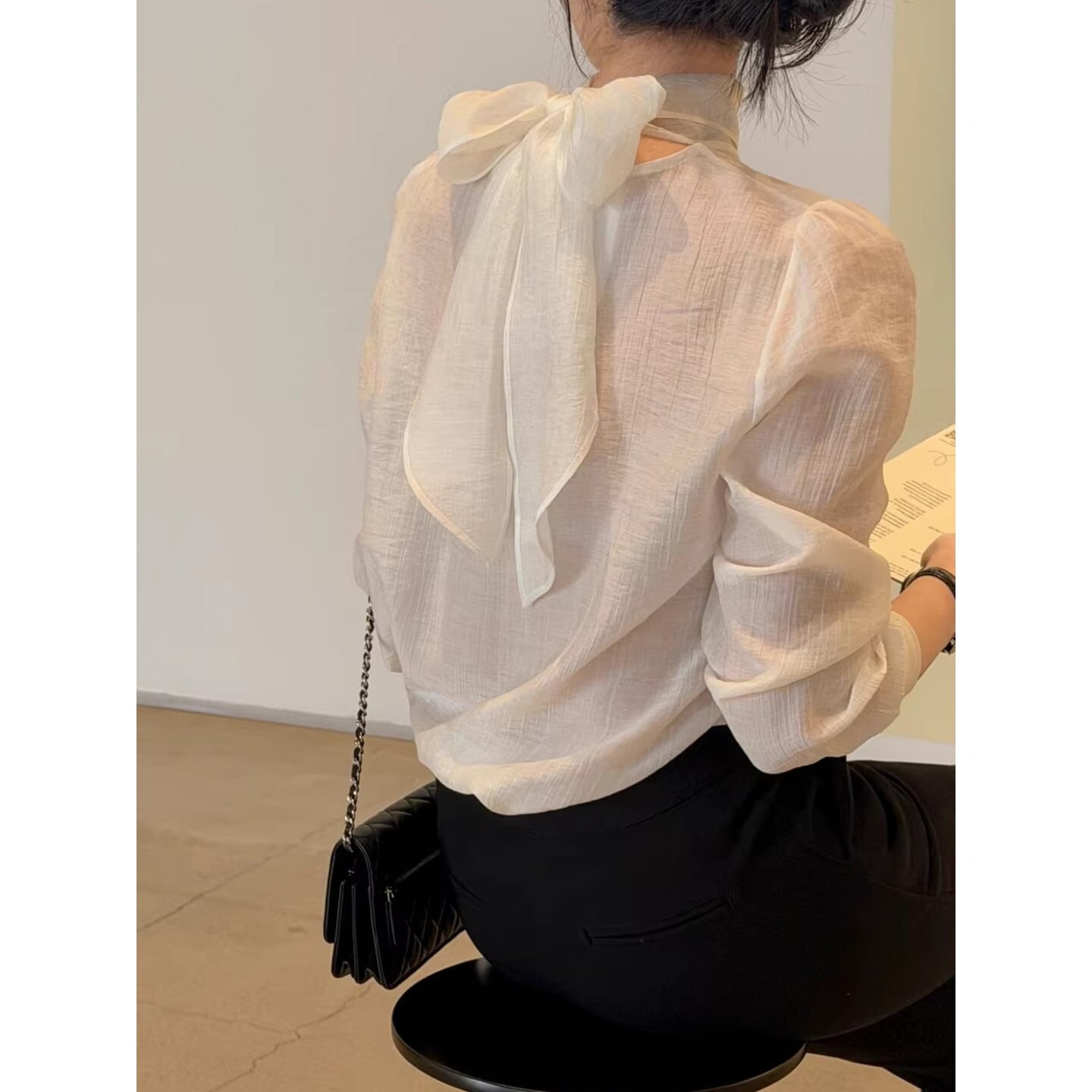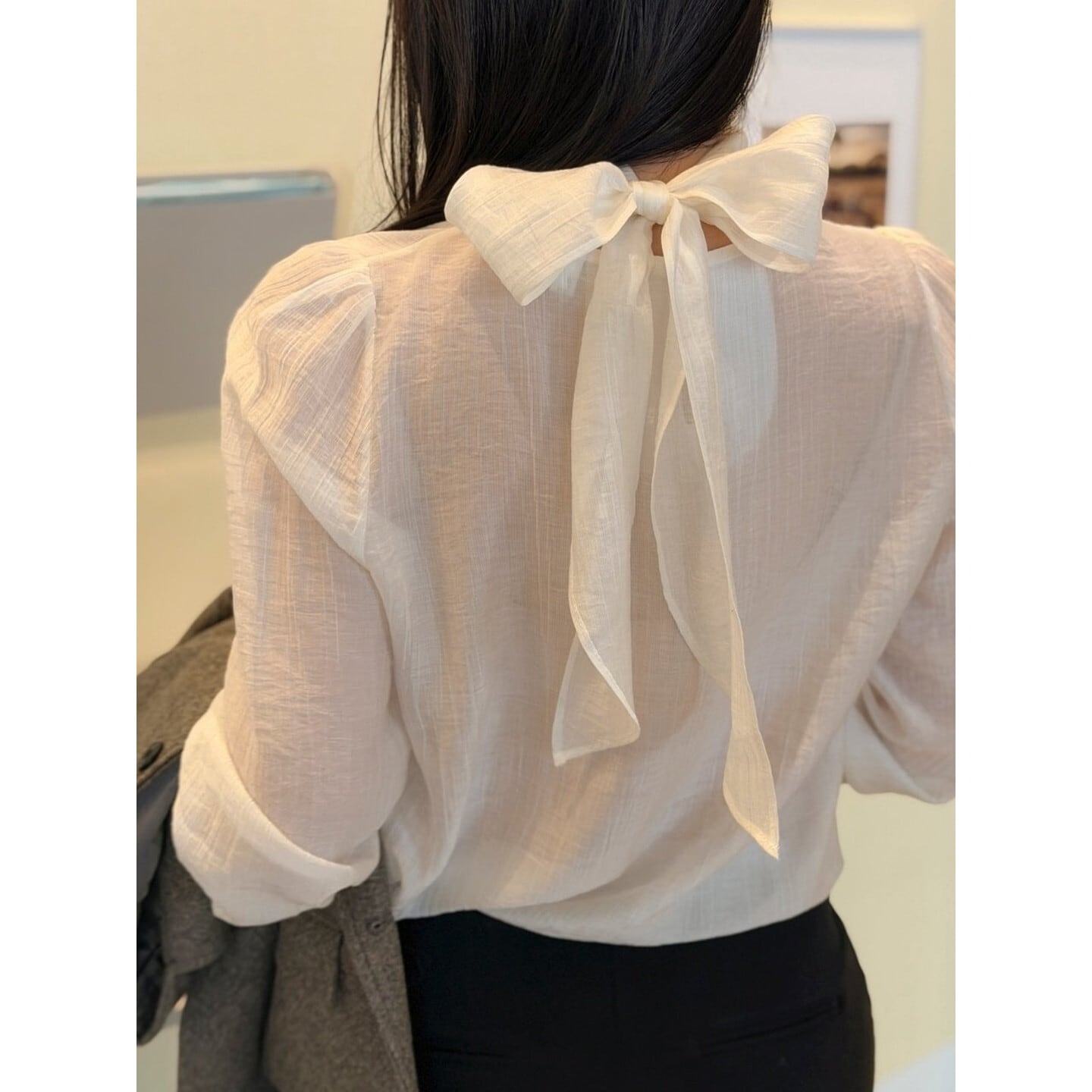 後ろ姿まで美しい、リボンタイデザインの長袖ブラウス。