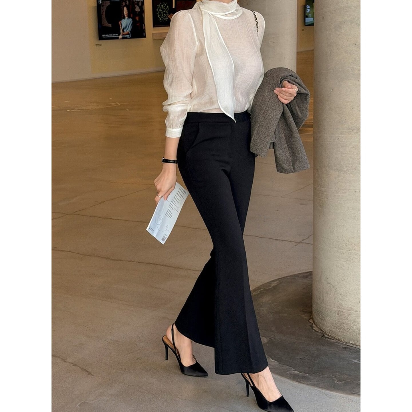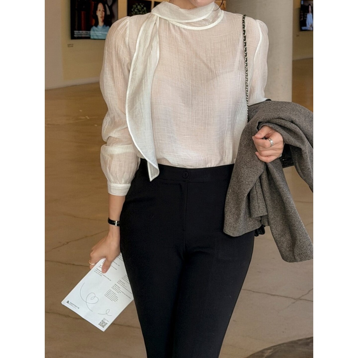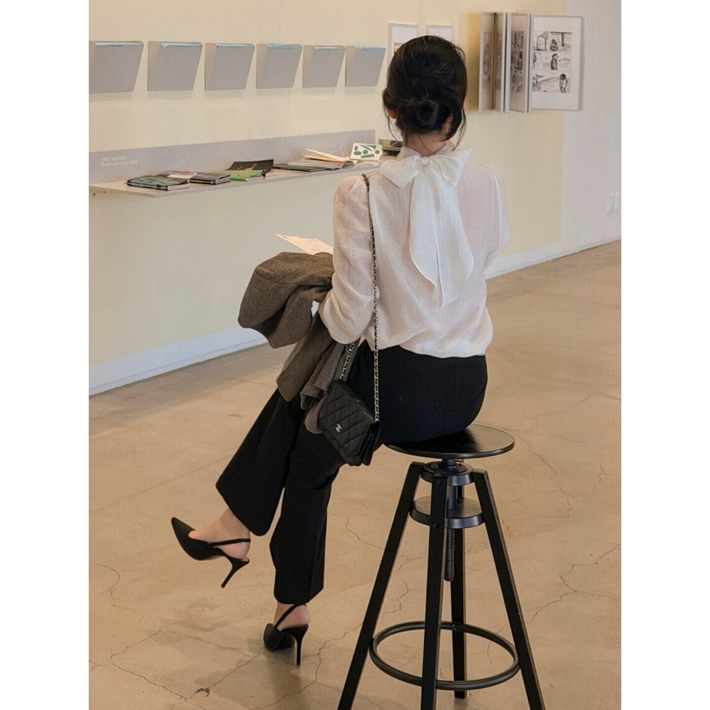 後ろ姿まで美しい、リボンタイデザインの長袖ブラウス。