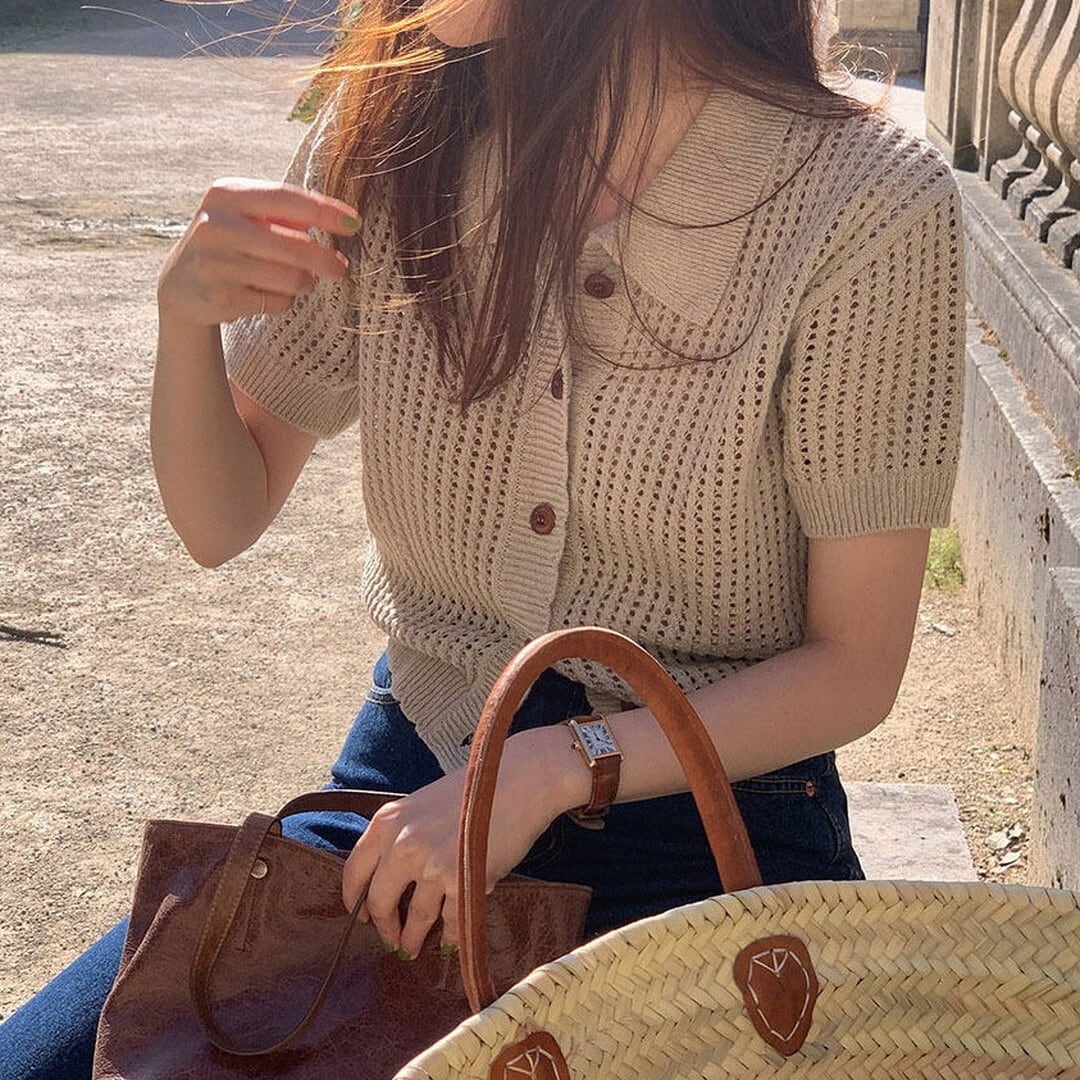 上品な着こなしを叶える、ポロカラー半袖ショートカーディガン。