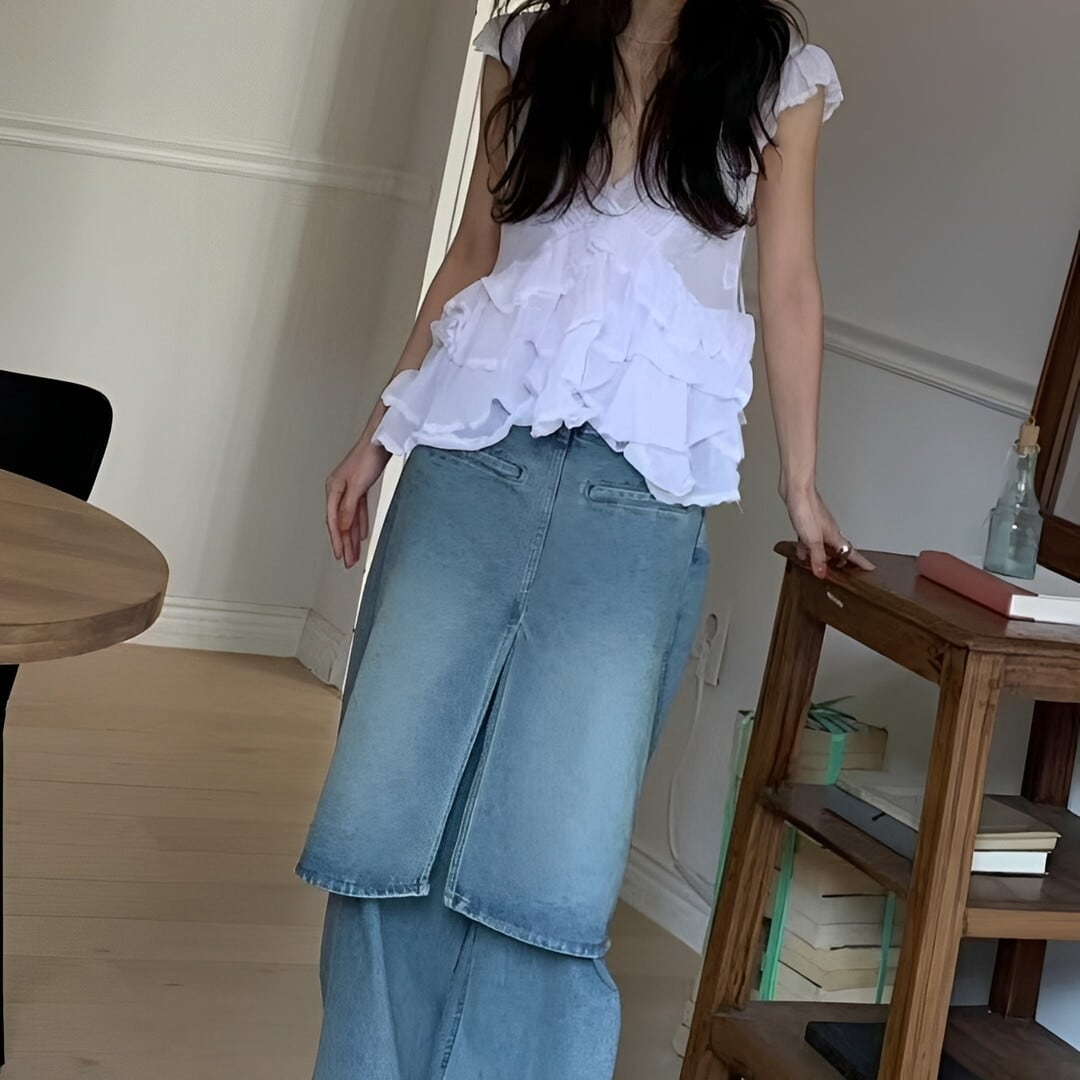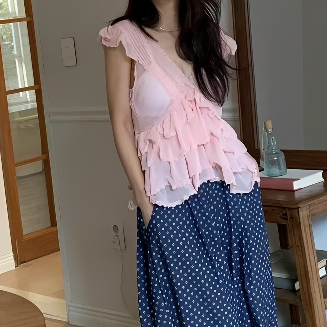 ティアードデザインが目を惹く、ノースリーブブラウス。