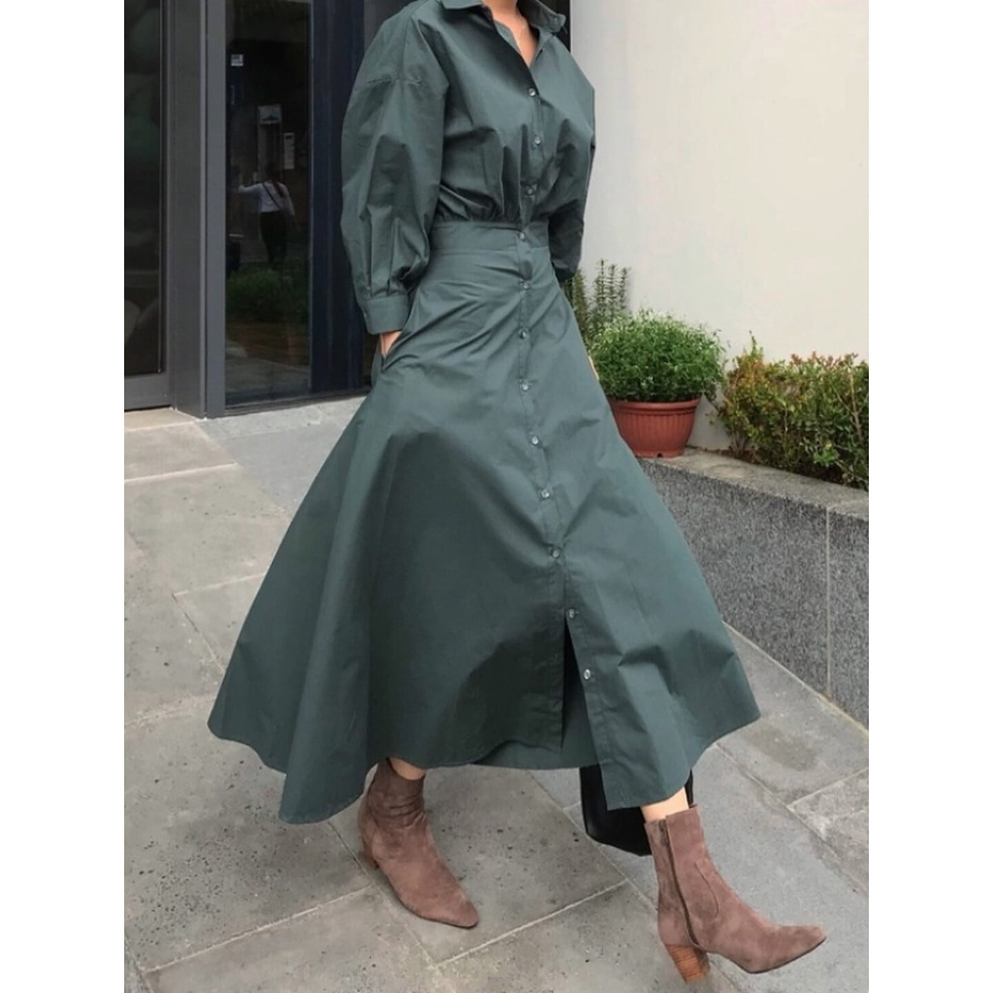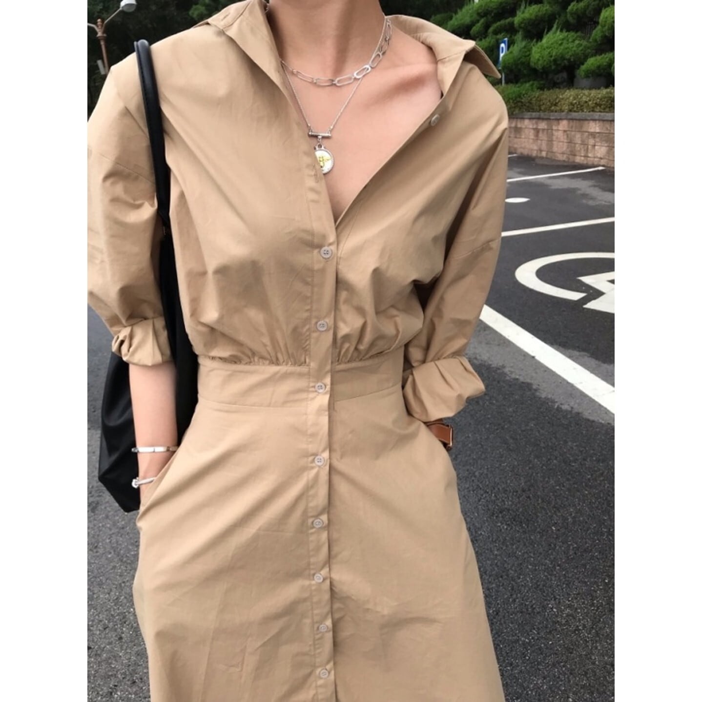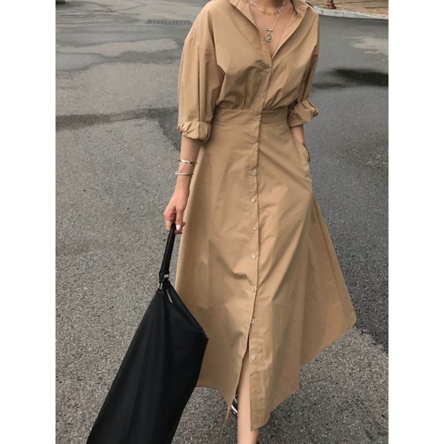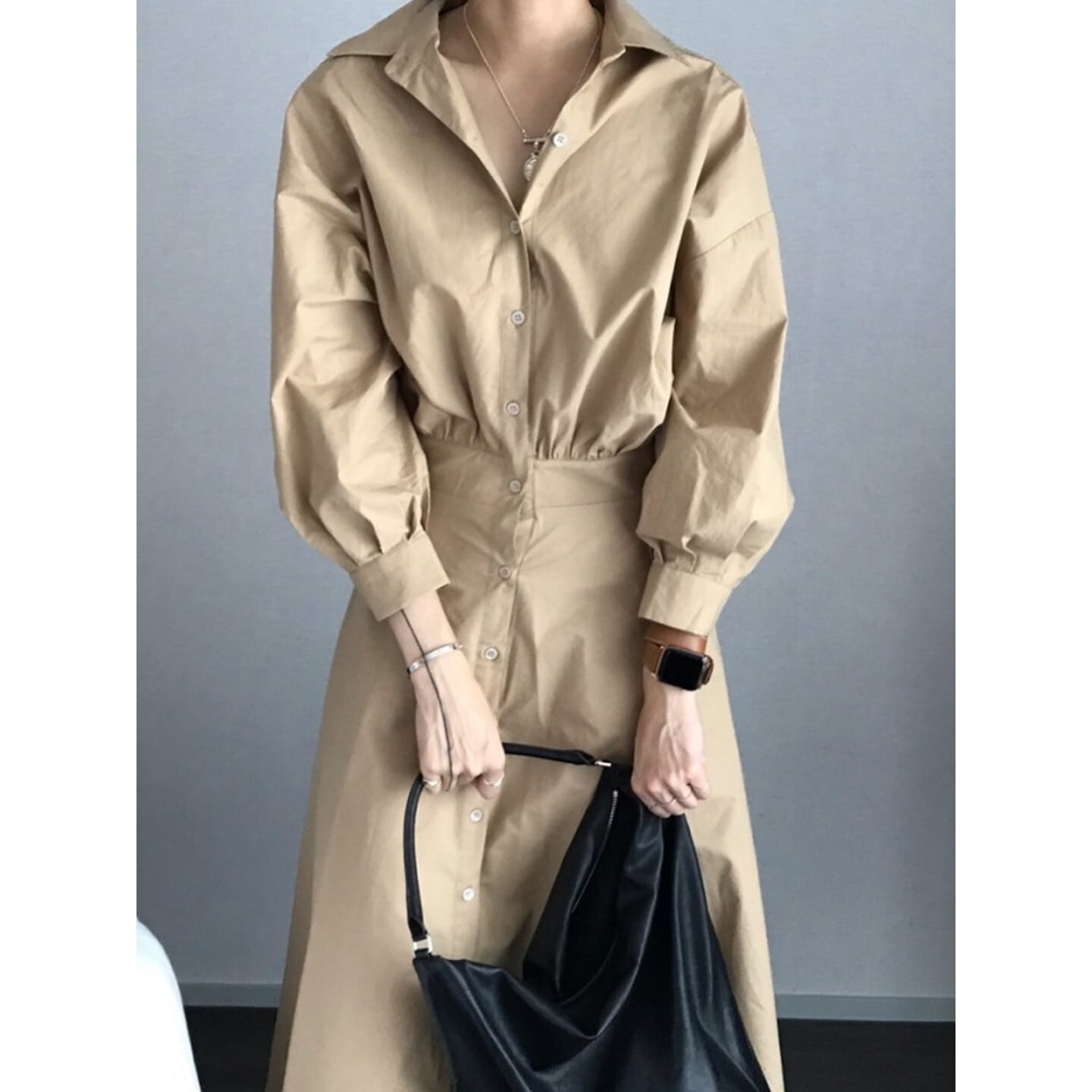 ウエストマークが女性らしいくびれを演出し、スッキリとした印象を与えます。