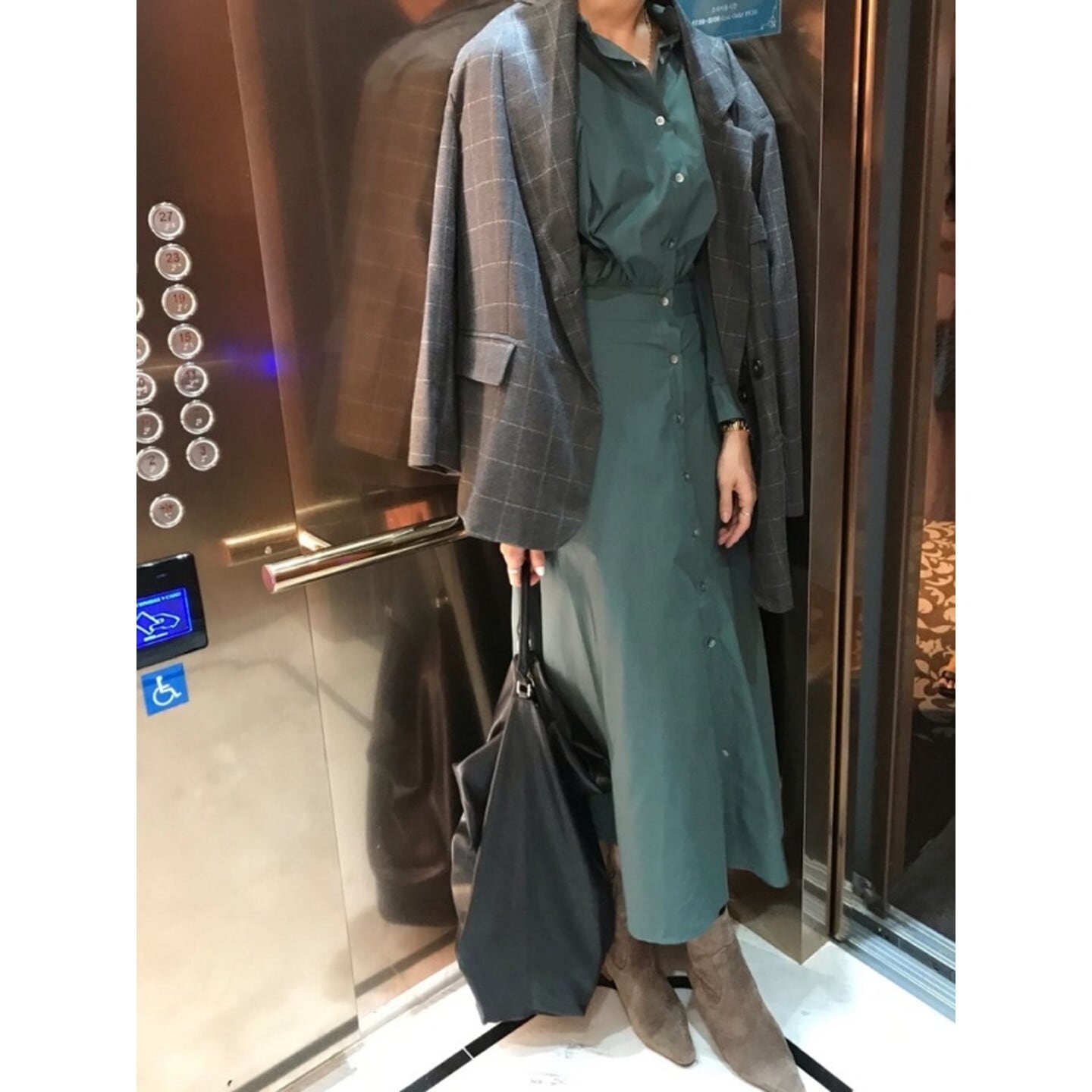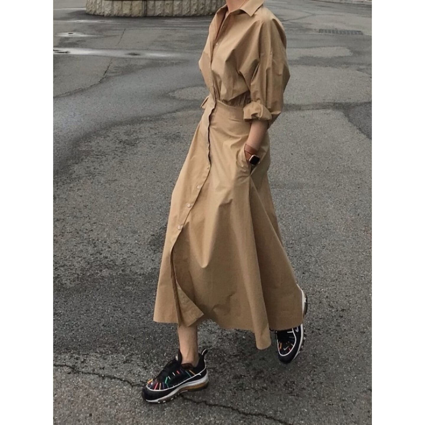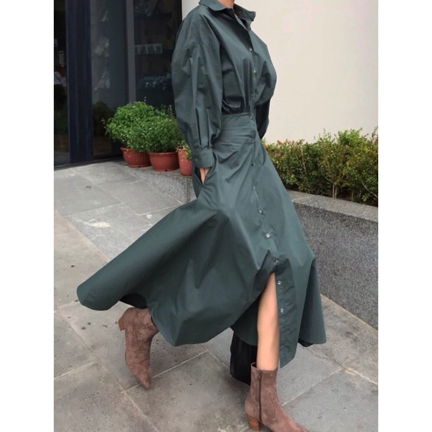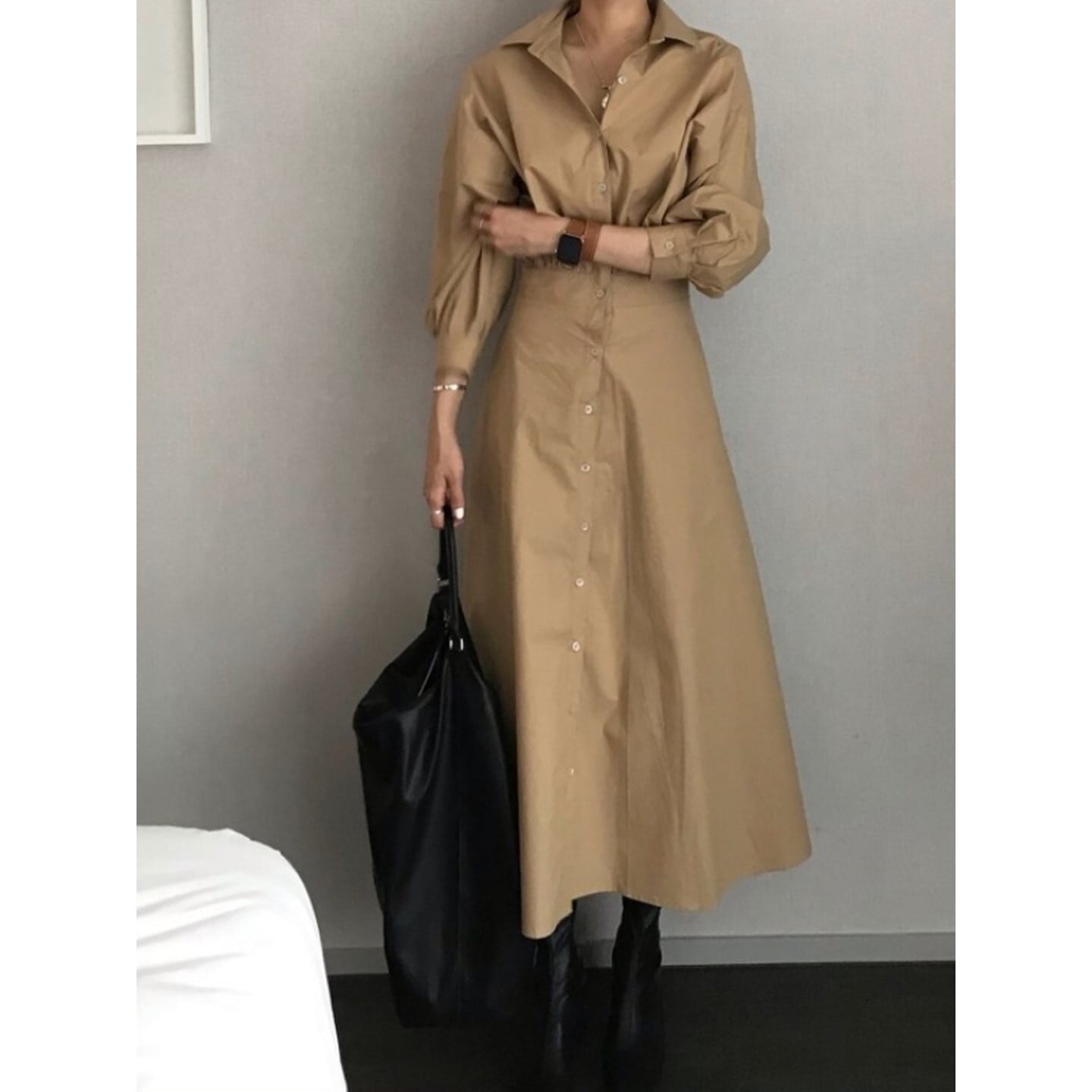 ウエストマークが女性らしいくびれを演出し、スッキリとした印象を与えます。