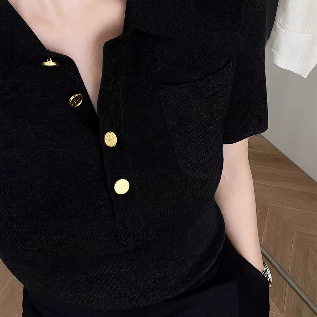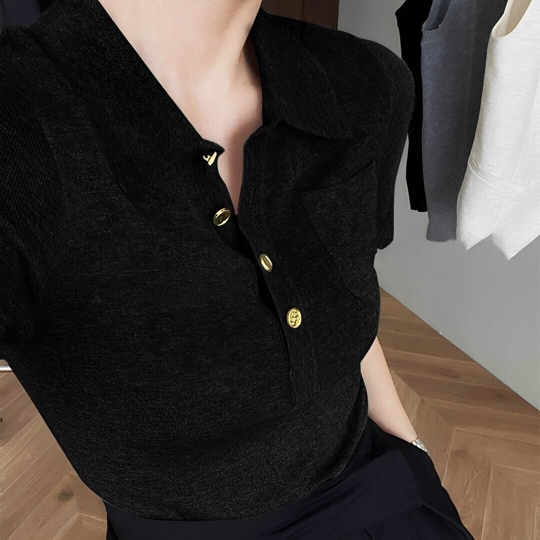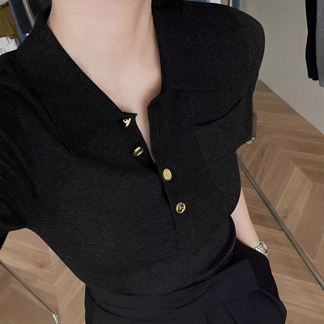 スリムなシルエットがスタイルを美しく引き立て、袖口や肩のボタンがさりげなくおしゃれなアクセントを加えています。