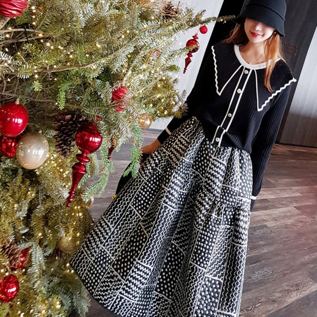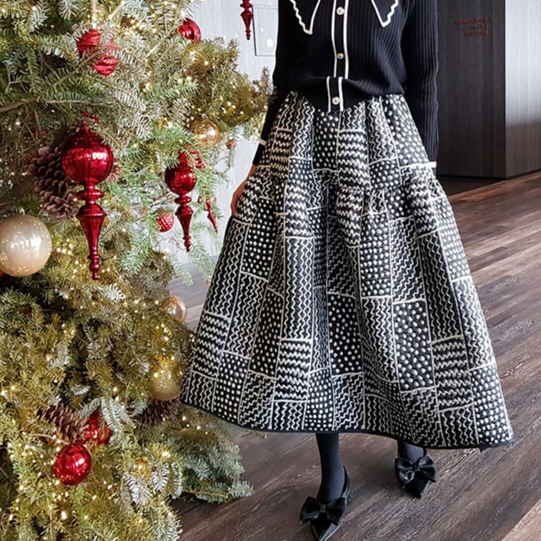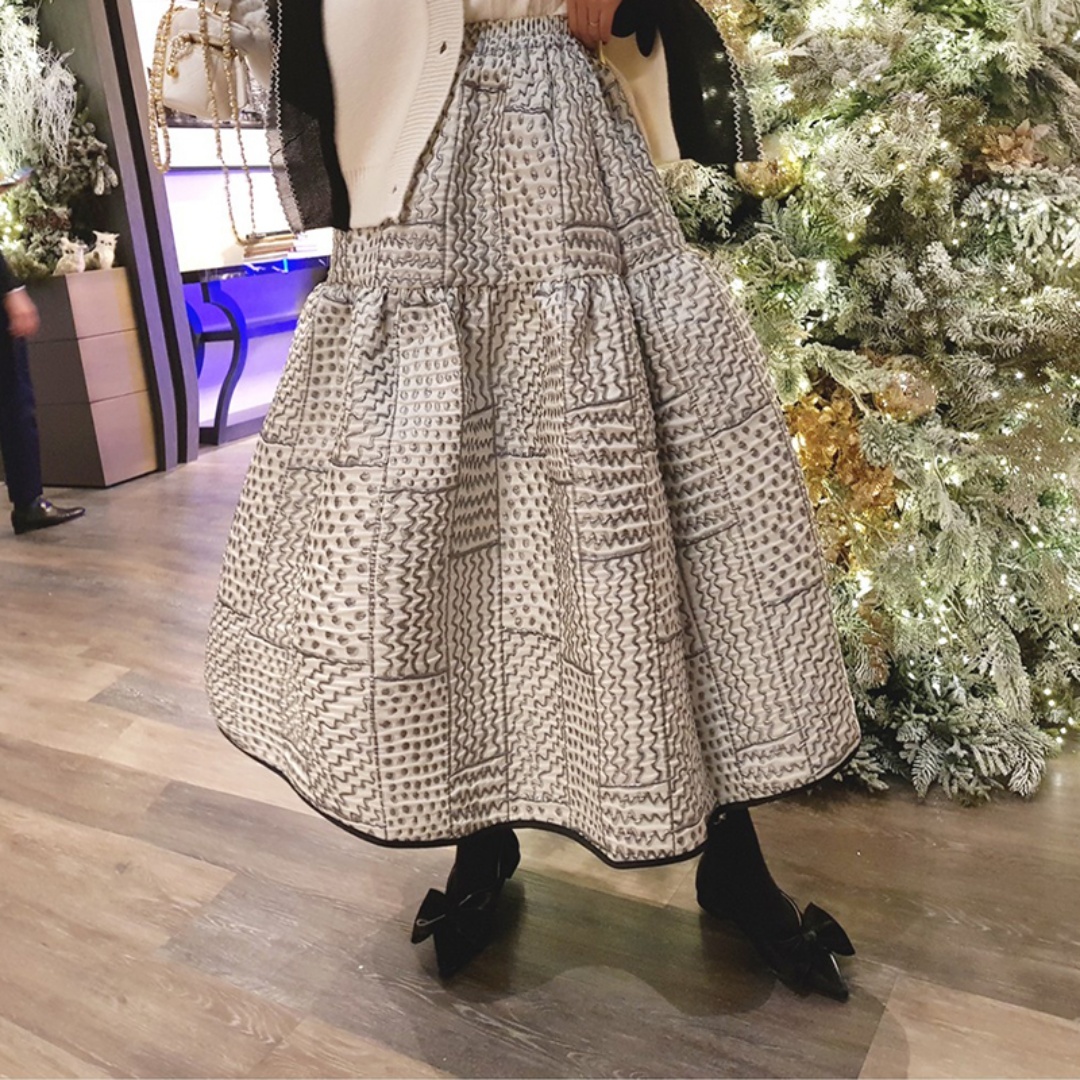 エレガントな印象を与えるジャガードフレアロングスカート。