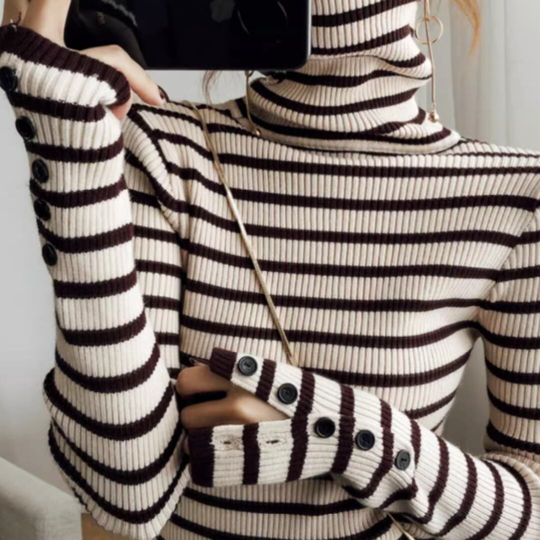 ブレスボタンが上品なアクセントを加え、洗練された印象を演出します。秋冬のコーディネートにぴったりのアイテムで、カジュアルからフォーマルまで幅広く活躍します。