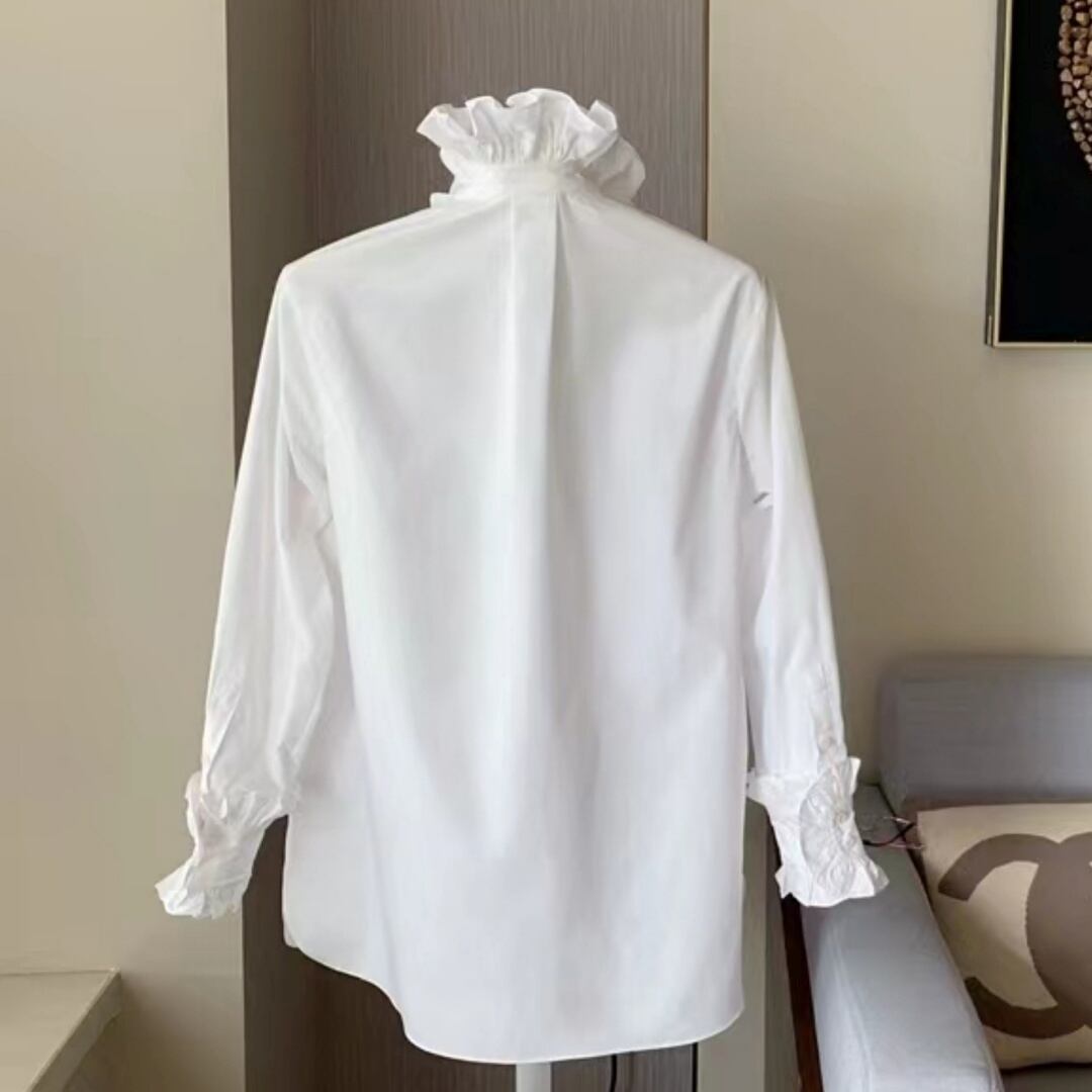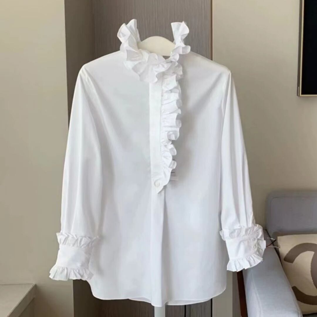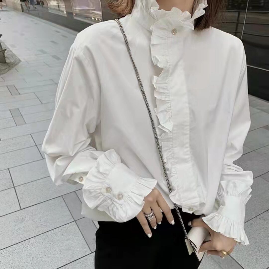 エレガントなスタンドカラーとフリルディテールが特徴のブラウス。