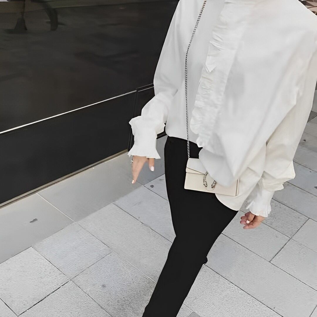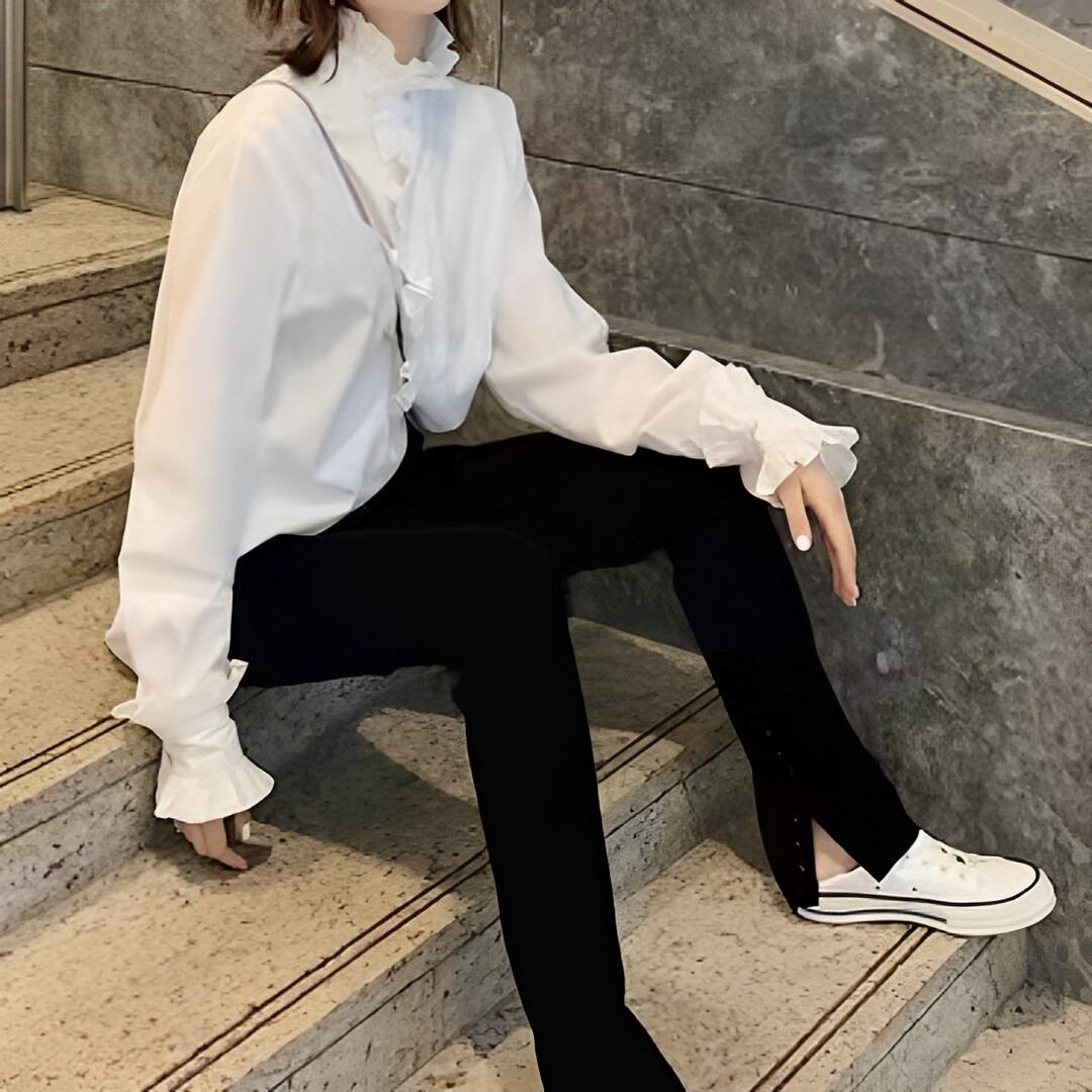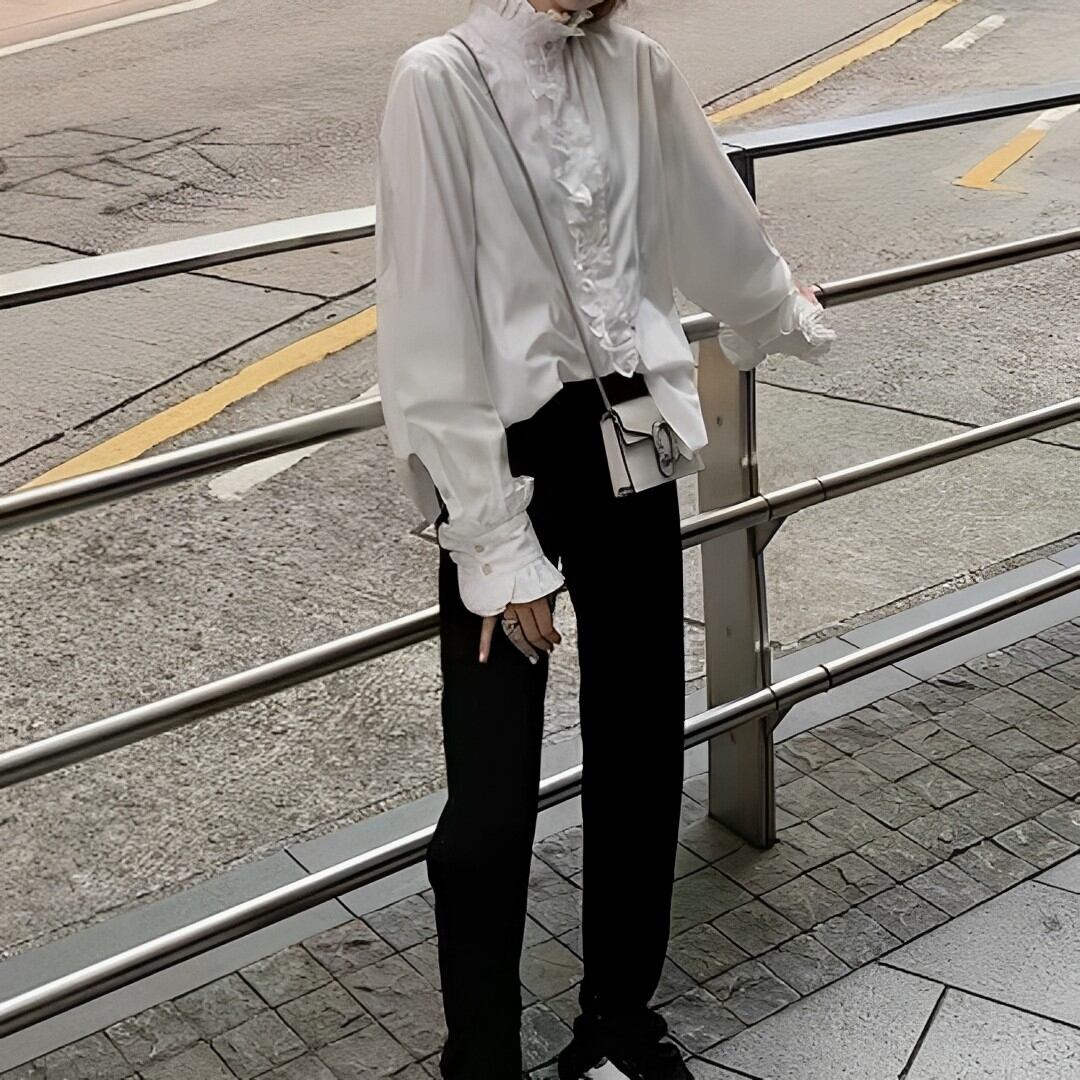 エレガントなスタンドカラーとフリルディテールが特徴のブラウス。