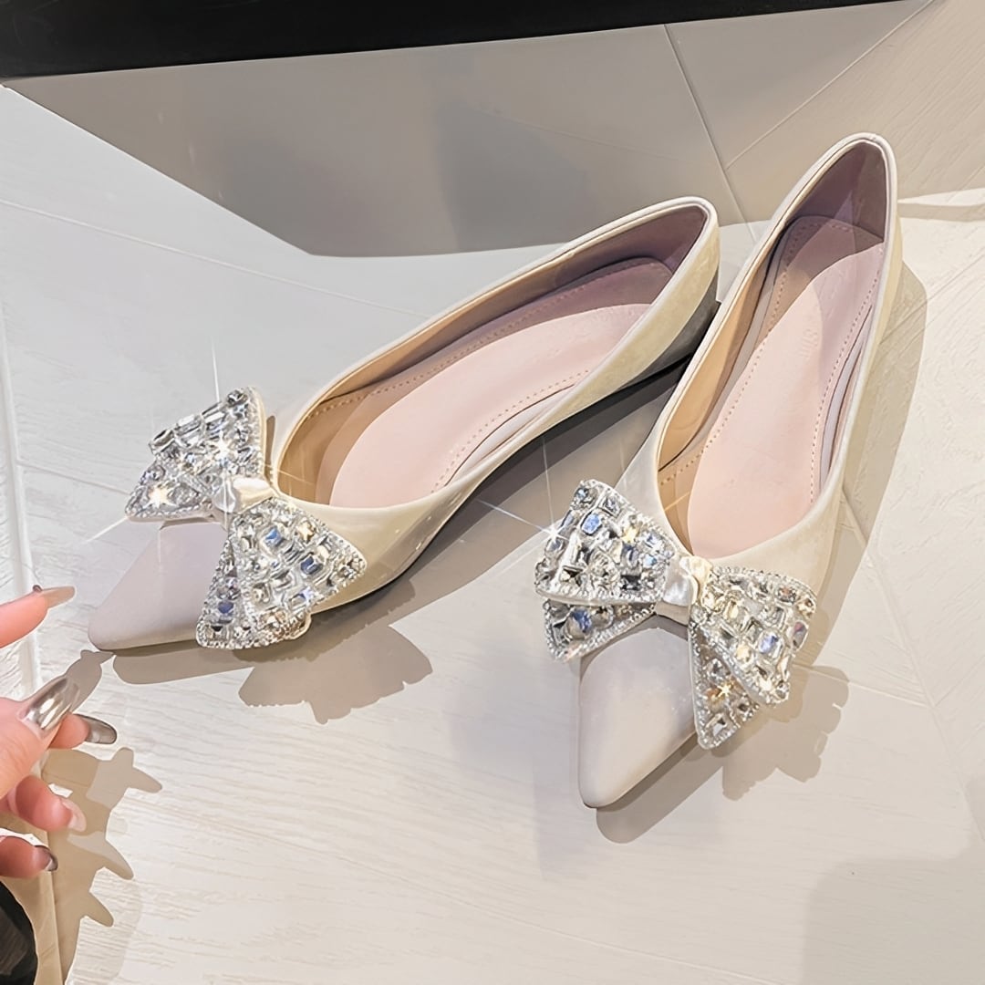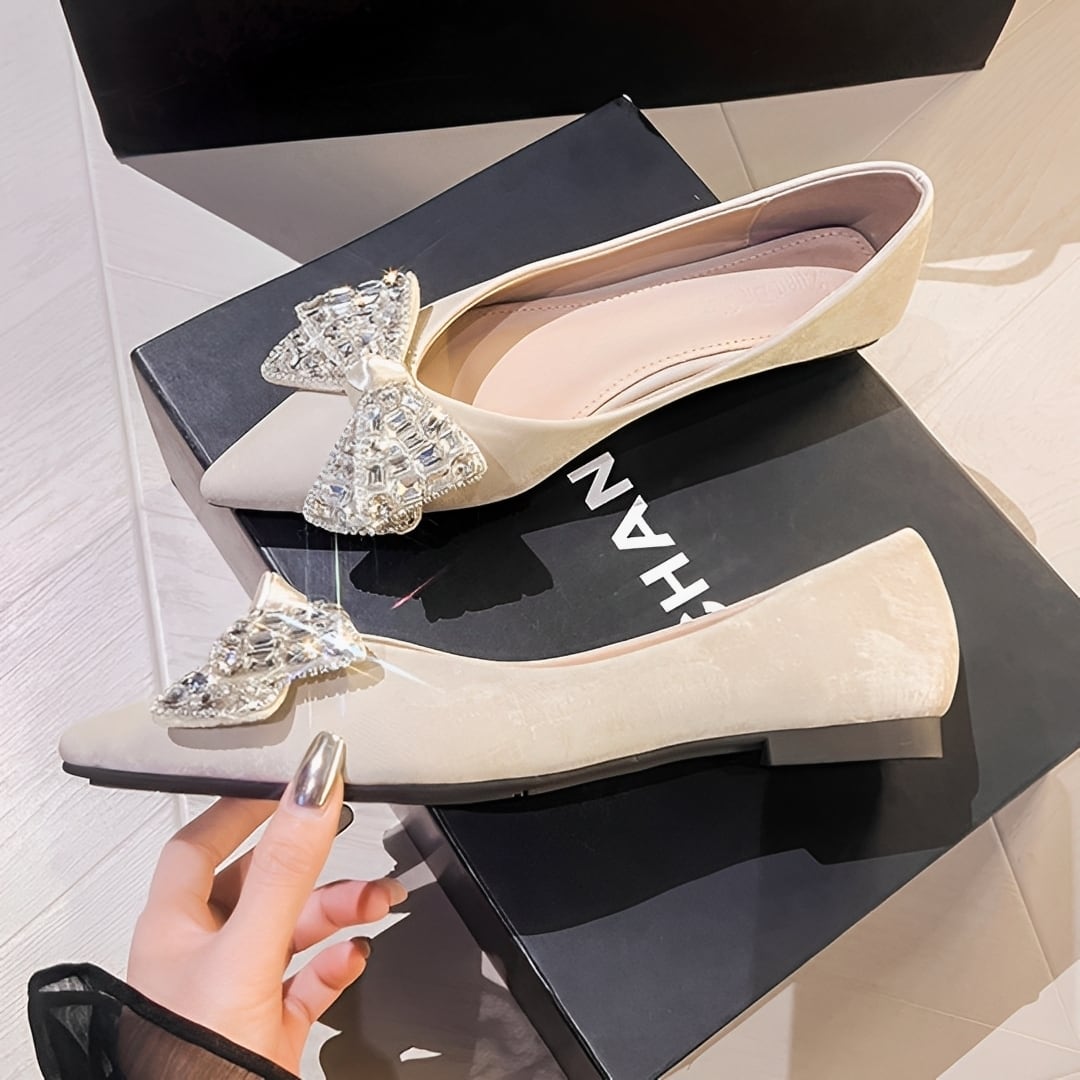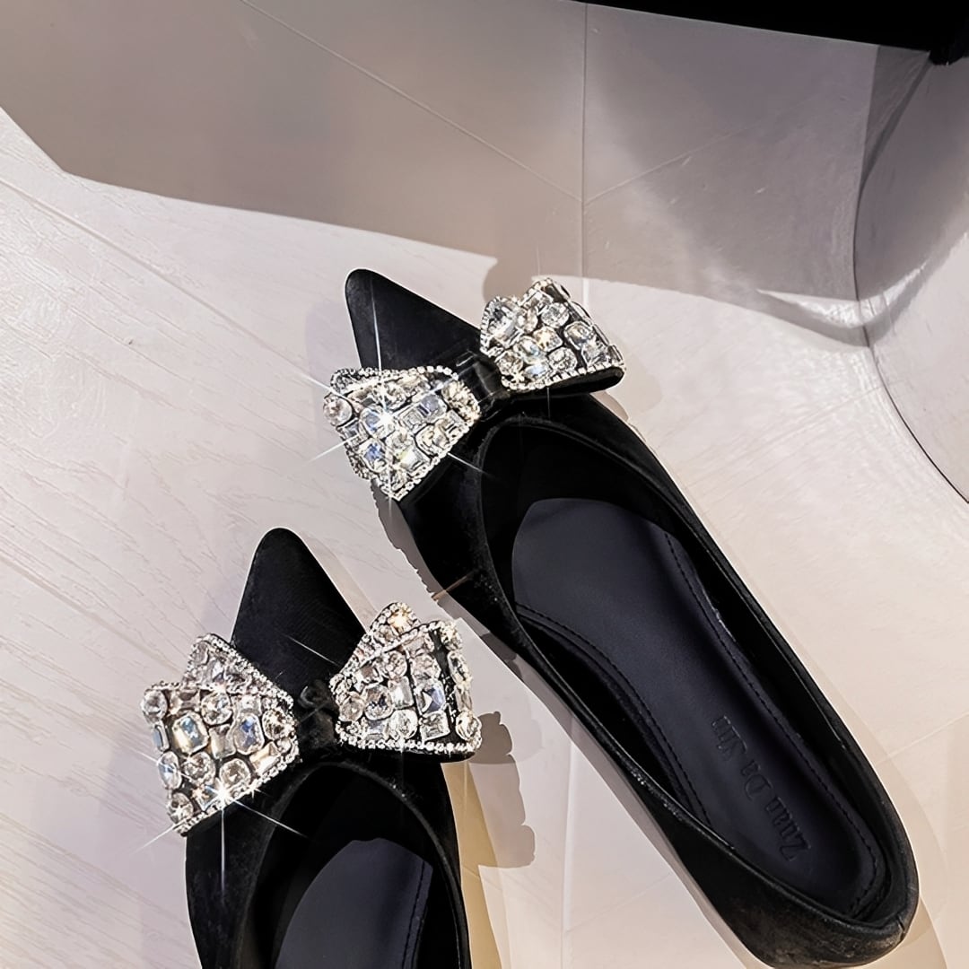 輝くビジュが華やかさをプラス/ポインテッドトゥで上品なシルエット/歩きやすいフラットデザイン/カジュアルからフォーマルまで幅広く活躍。