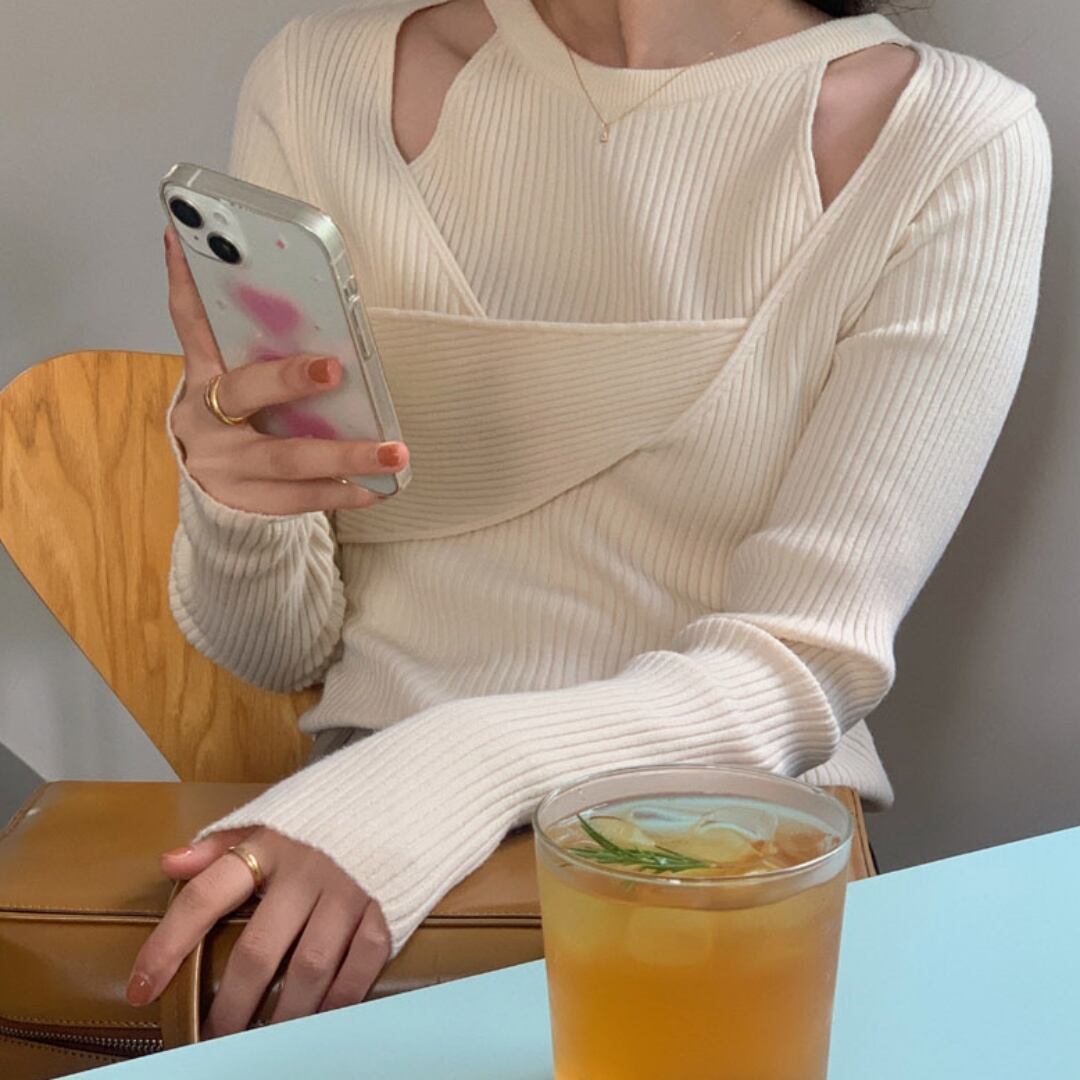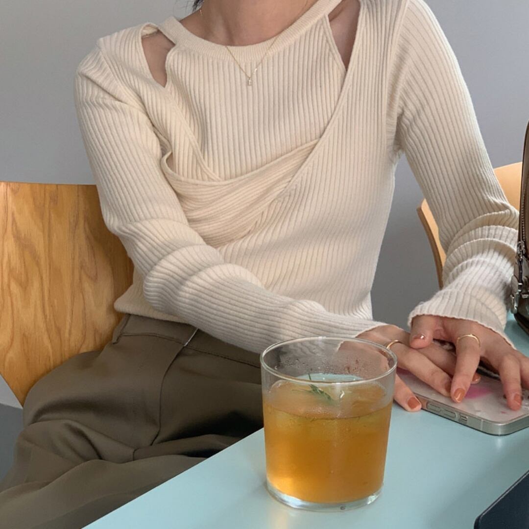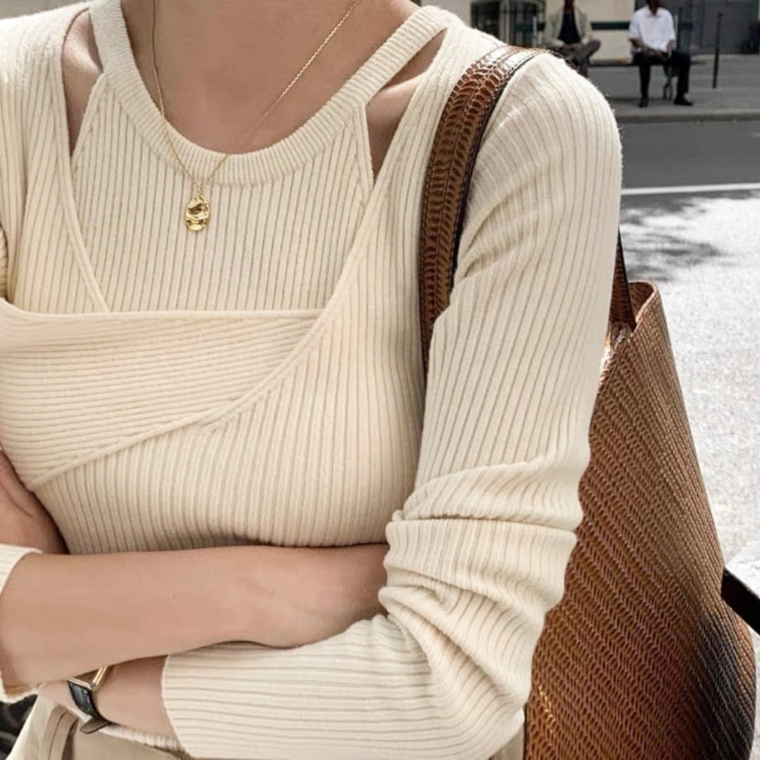シンプルながらもひとクセ効いたデザインが魅力のリブニットタンク+クロスニットのセットアイテム。