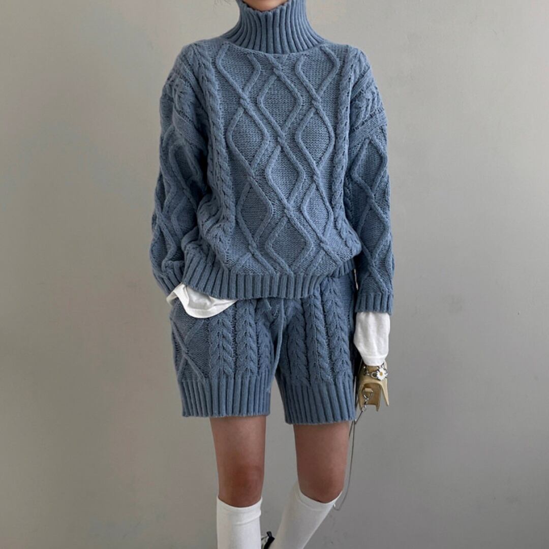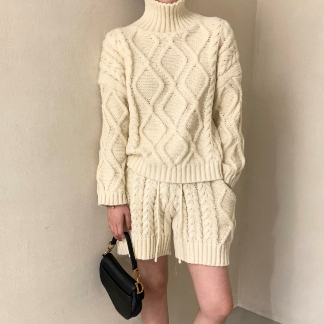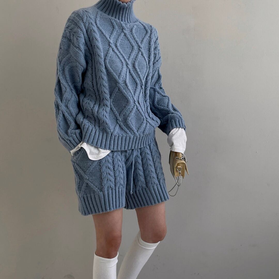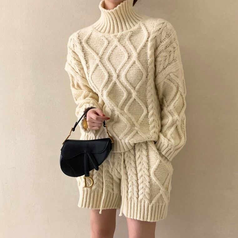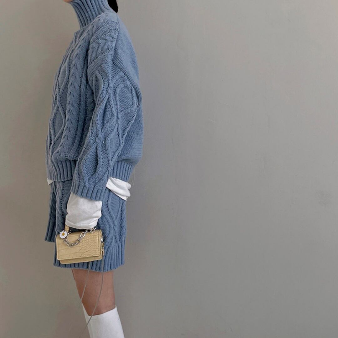 トレンド感のあるケーブルニットデザインが魅力のセットアップ。トップスとスカートがセットになったアイテムで、コーディネートいらず!